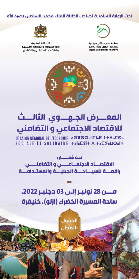 تحت الرعاية السامية لصاحب الجلالة الملك محمد السادس نصره الله وأيده، ينظم مجلس جهة بني ملال-خنيفرة، وبشراكة مع وزارة السياحة والصناعة التقليدية والاقتصاد الاجتماعي والتضامني، المعرض الجهوي للاقتصاد الاجتماعي والتضامني في نسخته الثالثة خلال الفترة الممتدة من 28 نونبر و إلى غاية 03 دجنبر