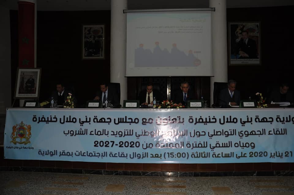 يشرفني أن أتناول الكلمة أمامكم اليوم في فعاليات هذا اللقاء التواصلي الهام. ويسعدني في البداية أن أتقدم بالترحيب لكافة الحاضرين والمشاركين في أشغال هذا اللقاء التوصلي الجهوي حول البرنامج الأولوي الوطني للتزويد بالماء الشروب ومياه السقي، الذي تنظمه ولاية جهة بني ملال-خنيفرة بتعاون مع مجلس الجهة، والذي يندرج في سياق تنفيذ محاور الإتفاقية الإطار التي تم التوقيع عليها أمام أنظار صاحب الجلالة الملك محمد السادس نصره الله بتاريخ الإثنين 13 يناير 2020، خاصة منها المحور الخامس والمتعلق بالتواصل والتحسيس، والذي يروم تحسين مستوى التنسيق بين جميع المتدخلين في إنجاز هذا البرنامج وكذا تحسيس وتوعية مستعملي الماء، وعموم المواطنين بضرورة الإقتصاد في استخدامه و الرفع من مستوى إنتاجيته وتثمينه.