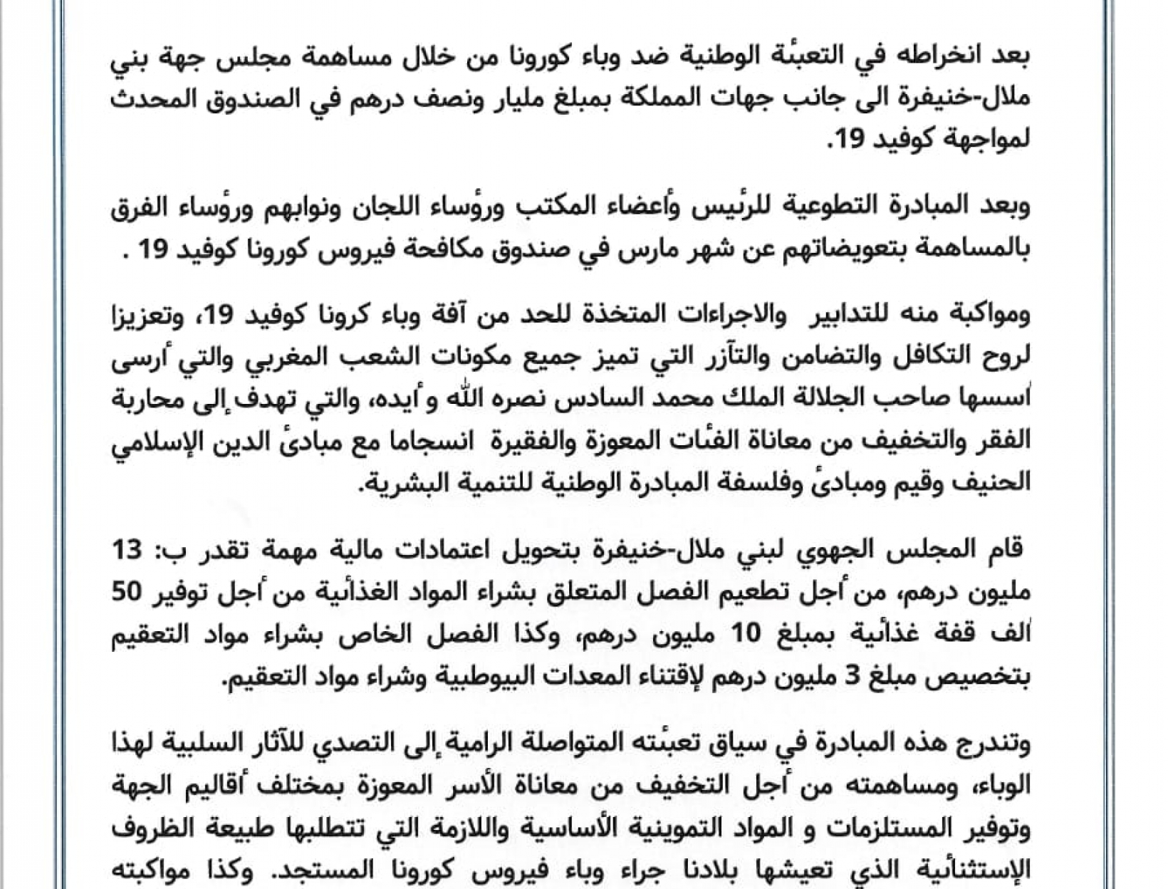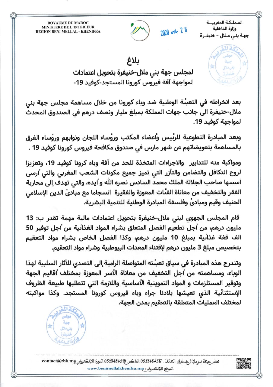 بلاغ لمجلس جهة بني ملال خنيفرة بتحويل اعتمادات حول افة فيروس كورونا المستجد كوفيد 19